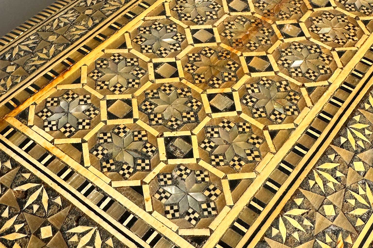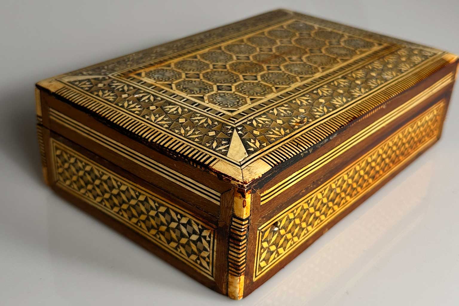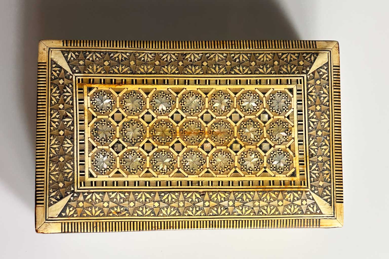 Of rectangular form, the exterior with micro mosaic marquetry inlaid surfaces in mother of pearl and wood, hinged lid Dimensions 20 x 12,7 x height 5,3 cm weight 397 grams